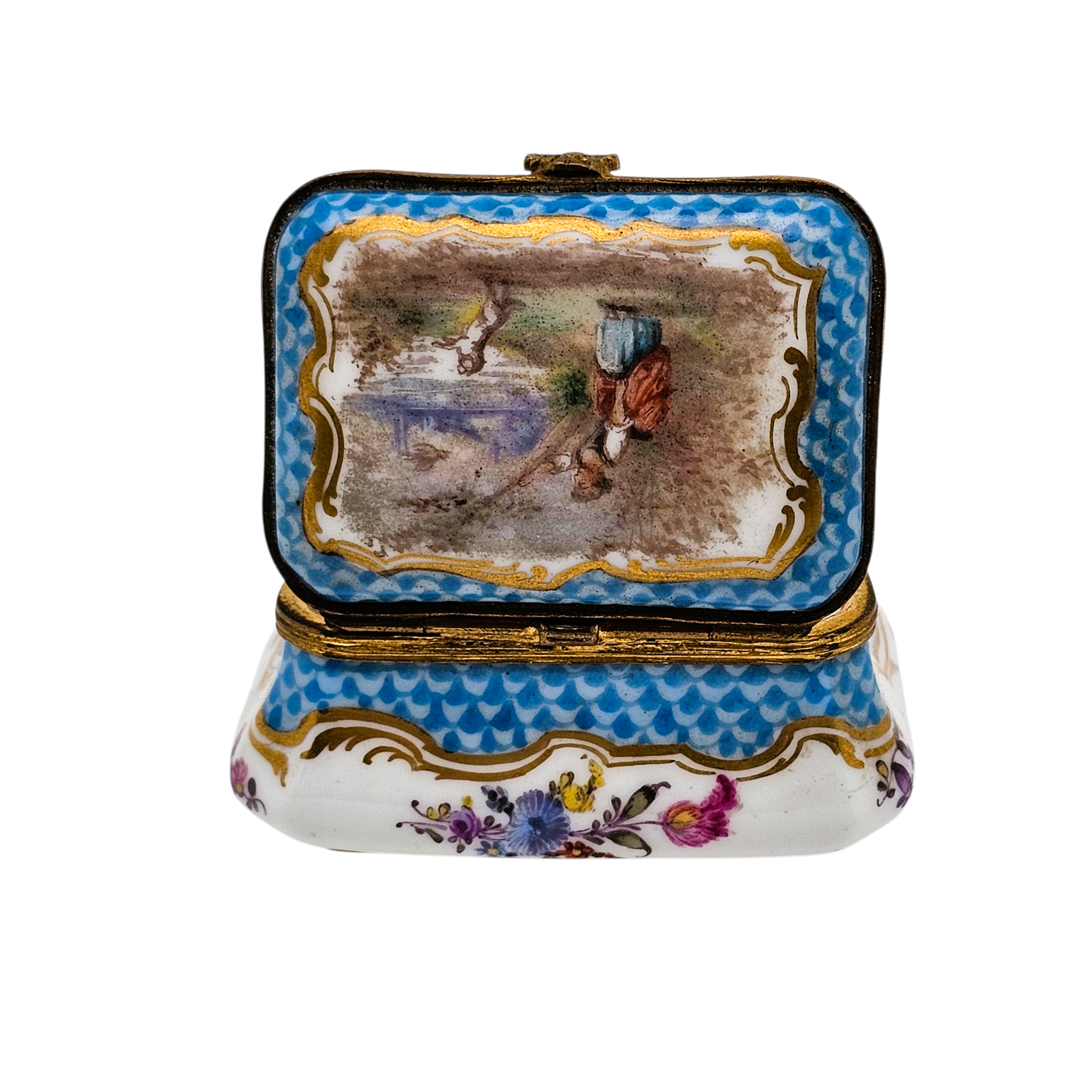 Le couvercle est orné d’une délicate scène pastorale représentant un personnage féminin accompagné d’un petit chien, dans un paysage doux aux tons nuancés.