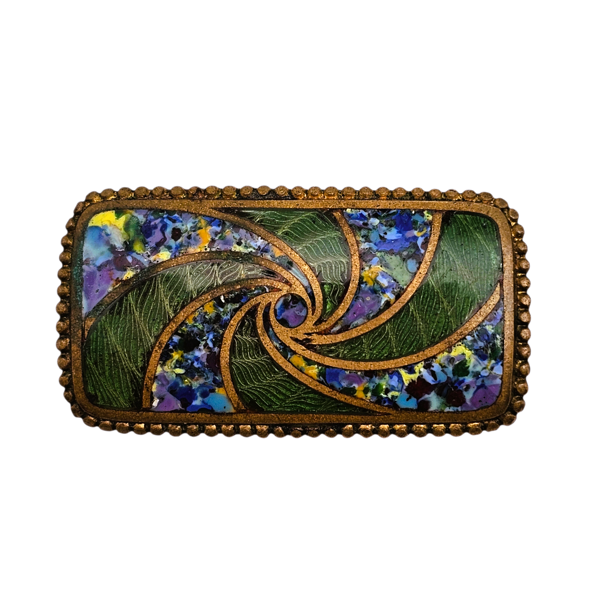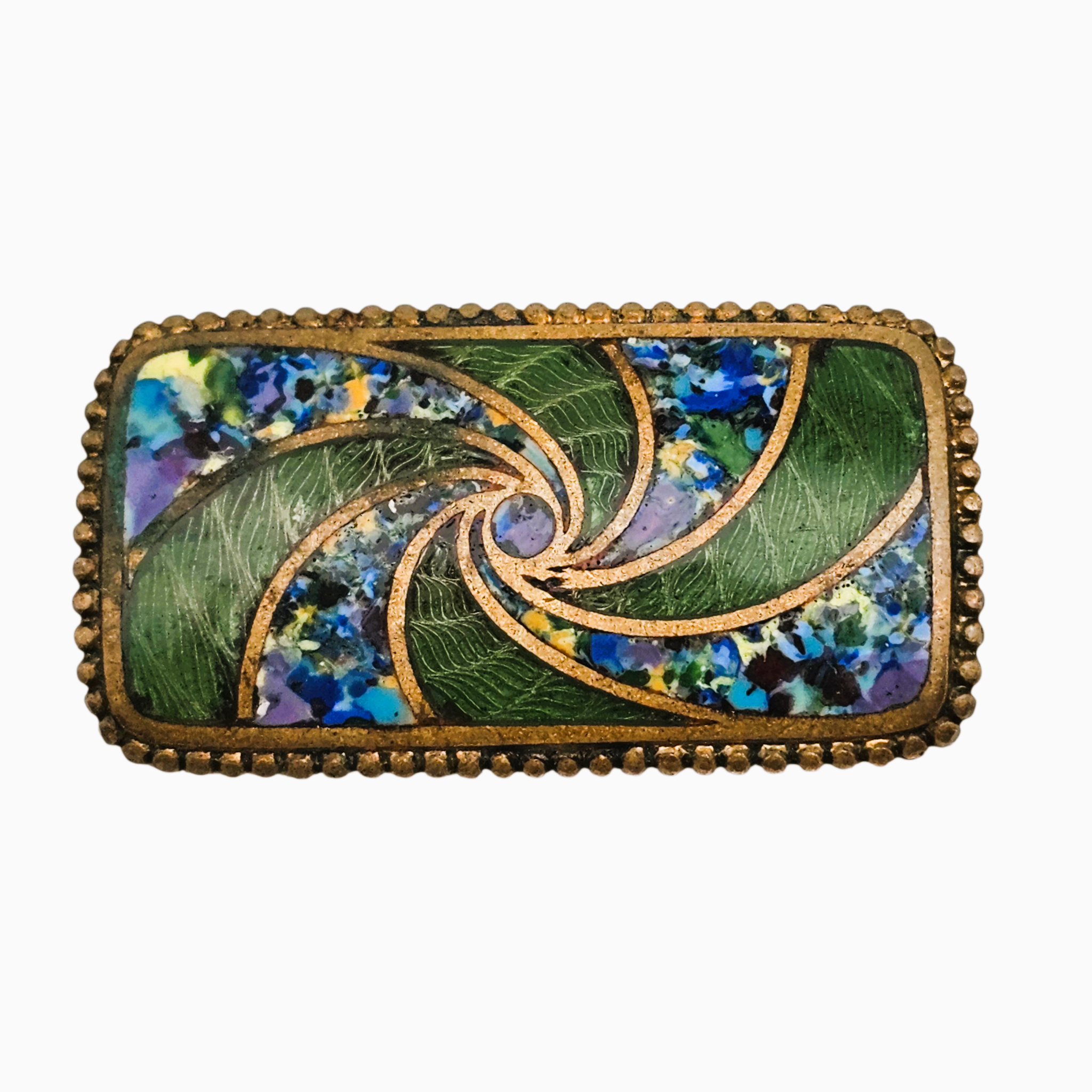 Élégante broche rectangulaire en émail cloisonné, ornée d’un décor spiralé aux lignes dynamiques, typique de l’esthétique Art déco.