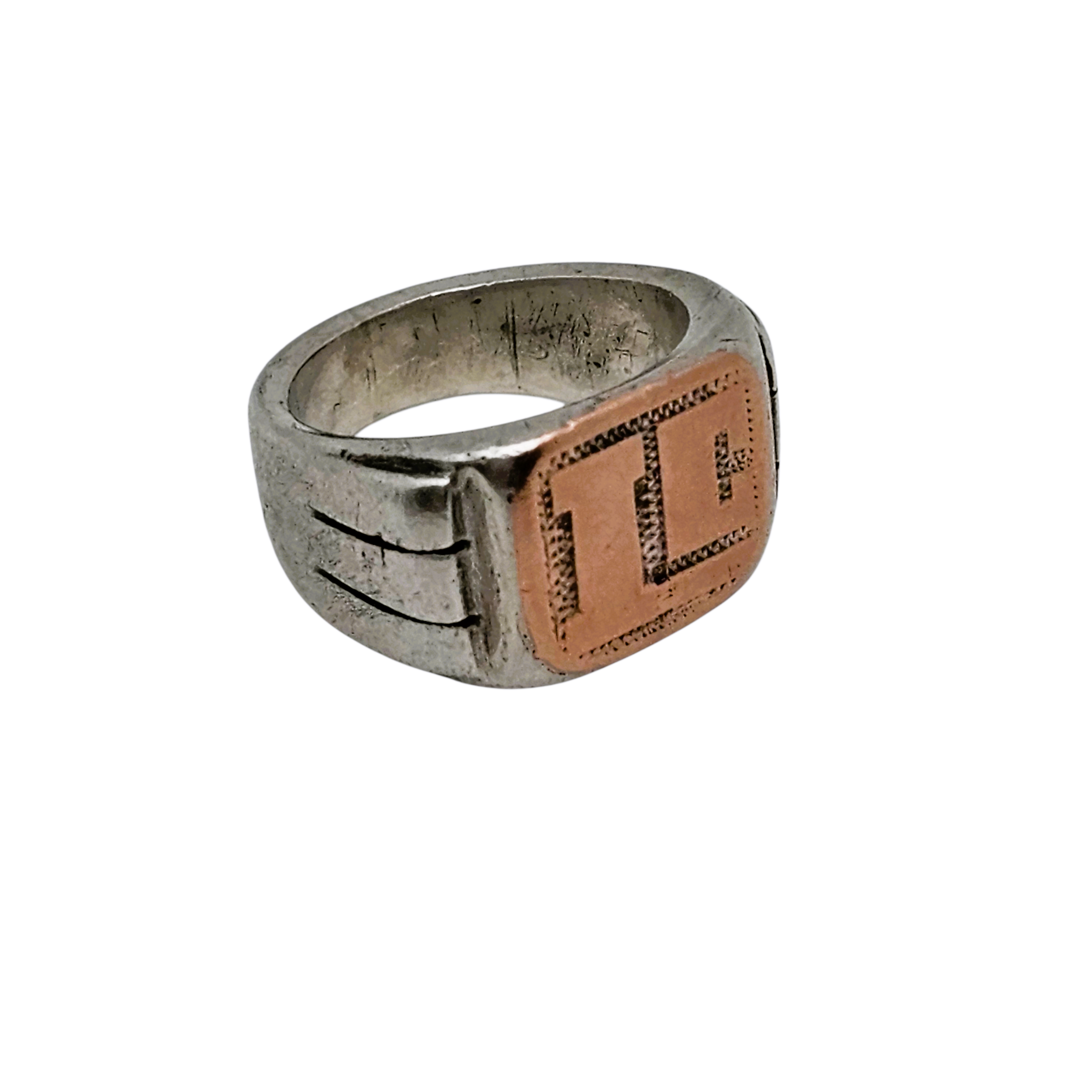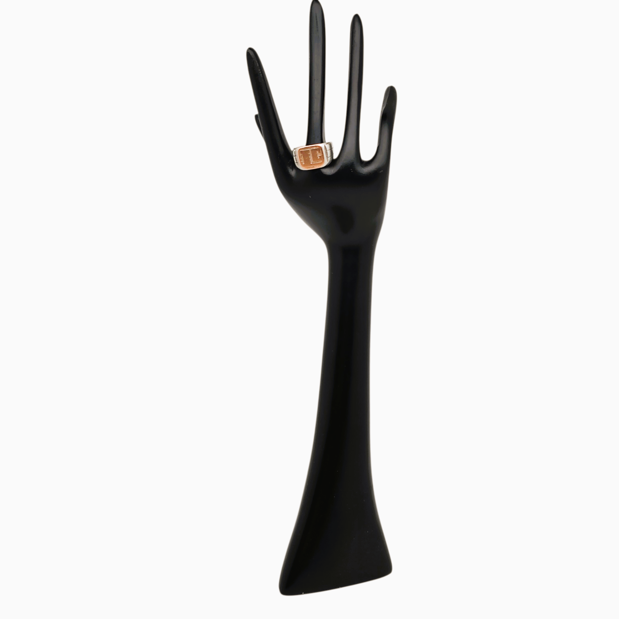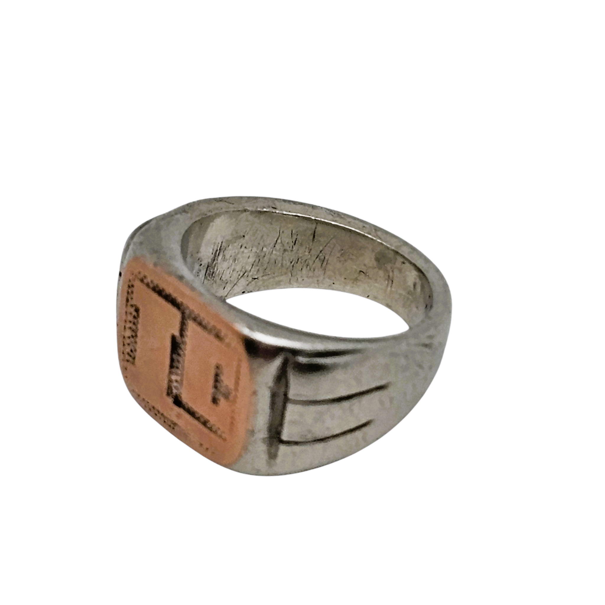 Le corps de la bague est en argent 800/1000 , comme l'atteste le poinçon A 800 visible à l'intérieur de l'anneau (partiellement effacé), tandis que le plateau est rehaussé d'un apport en ou rose , créant un contraste doux et élégant.