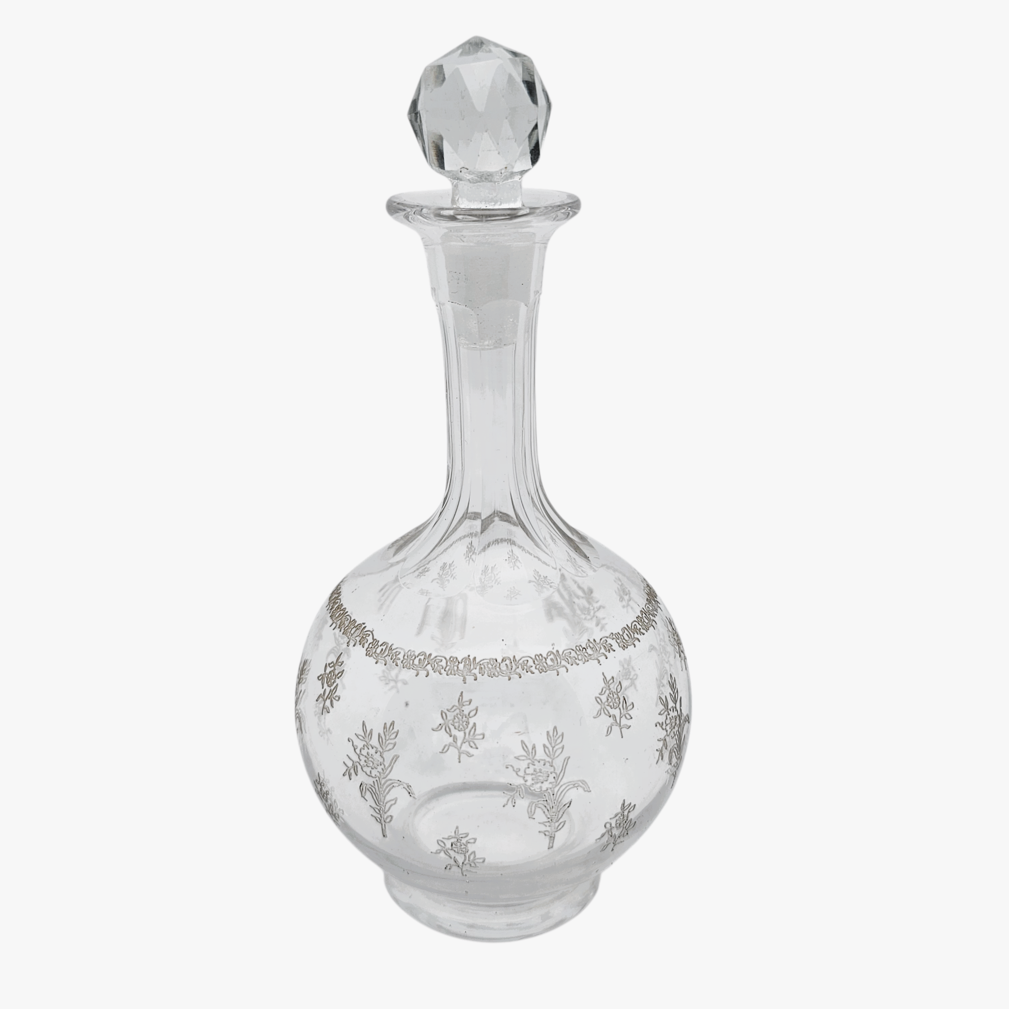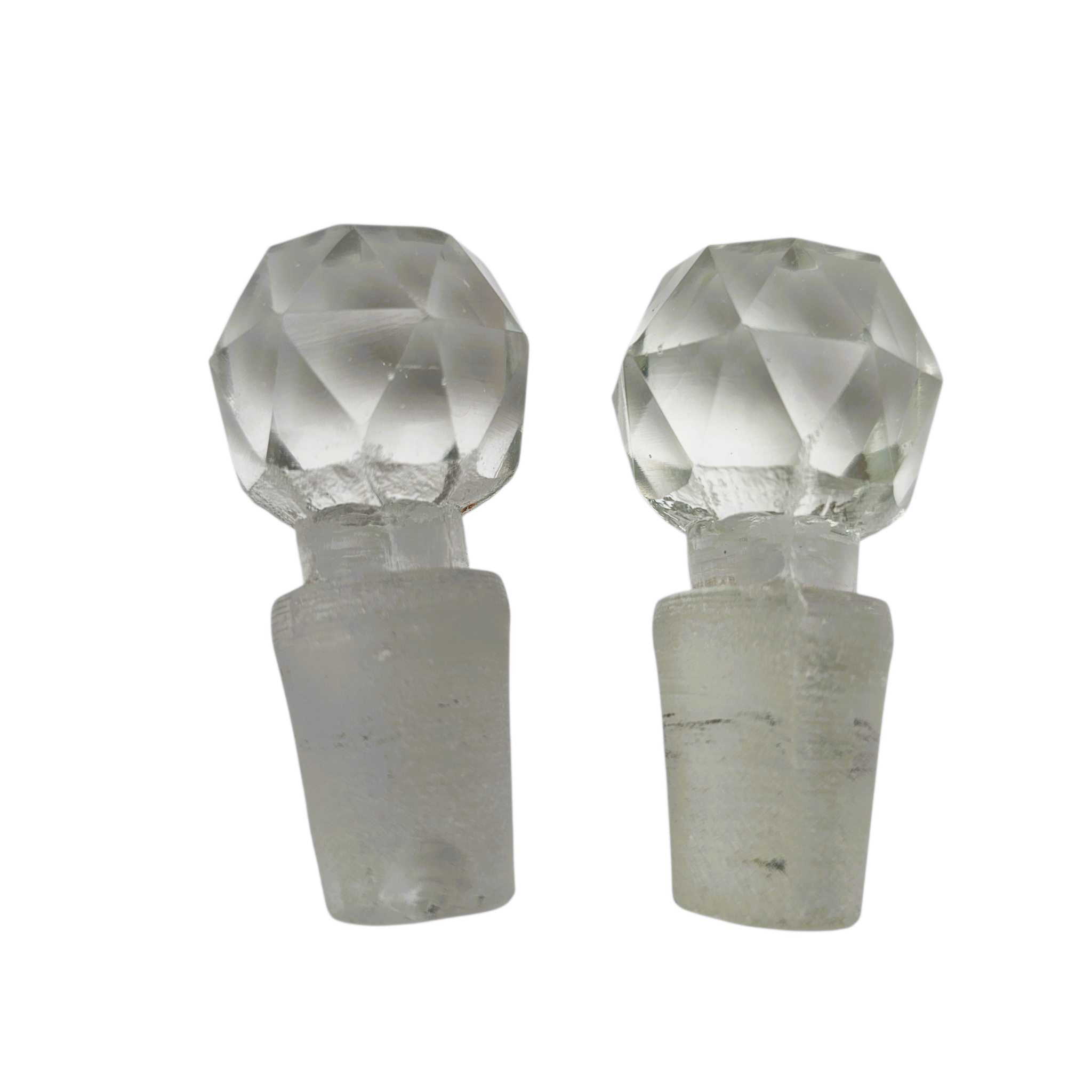 Les bouchons en verre taillé à facettes, bien qu’ajoutés ultérieurement, s’adaptent parfaitement aux flacons tant sur le plan esthétique que fonctionnel.