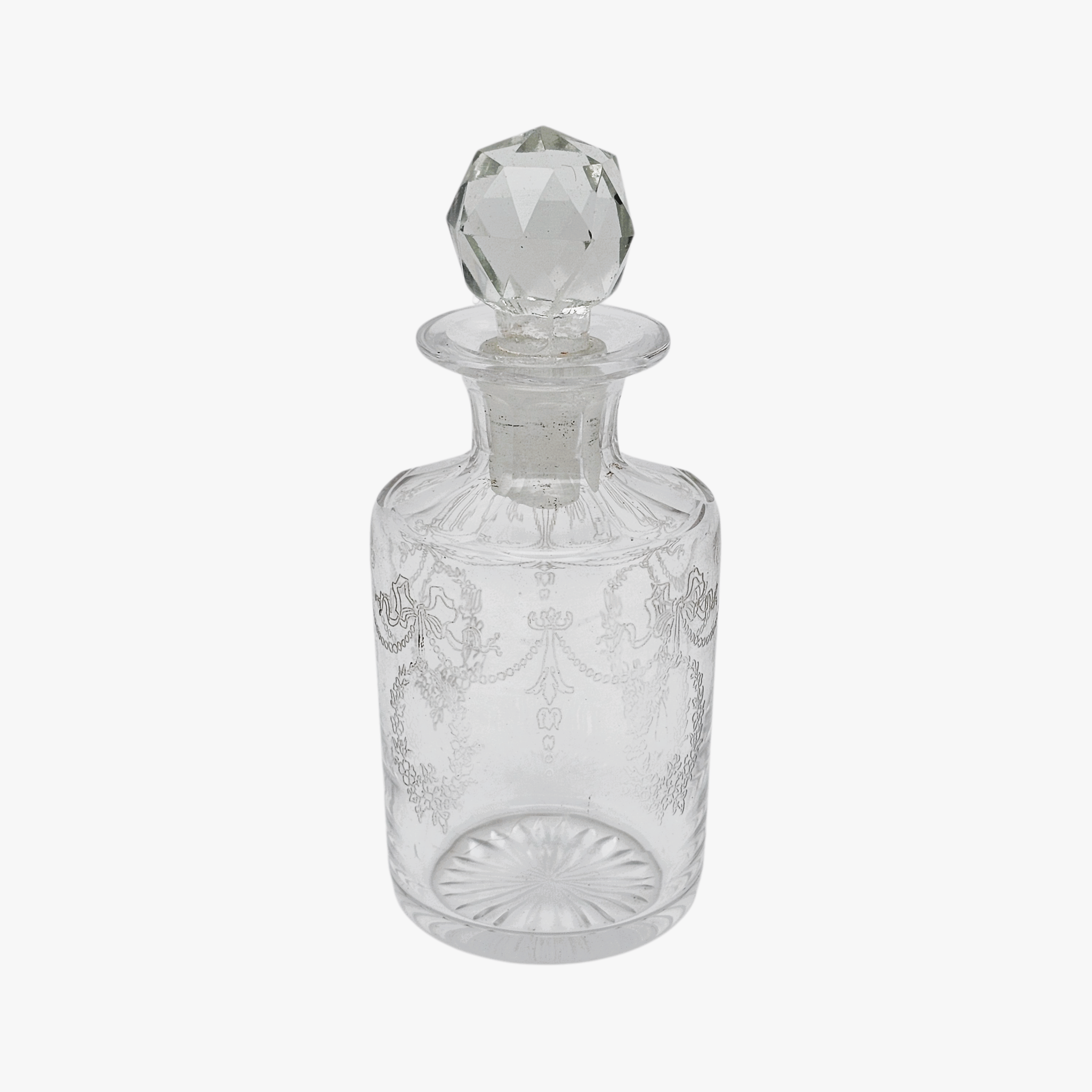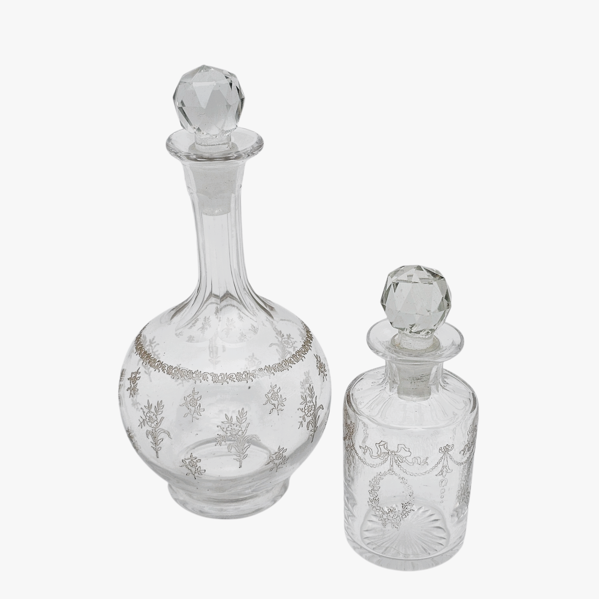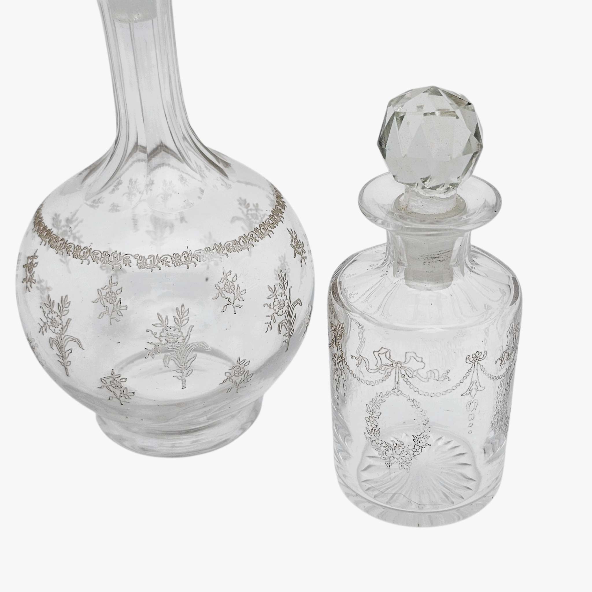Les deux flacons présentent un décor délicat d’inspiration néoclassique / Louis XVI : guirlandes, rubans, motifs floraux stylisés et frises gravées, typiques de la verrerie de toilette de la fin du XIXᵉ siècle – tout début XXᵉ.