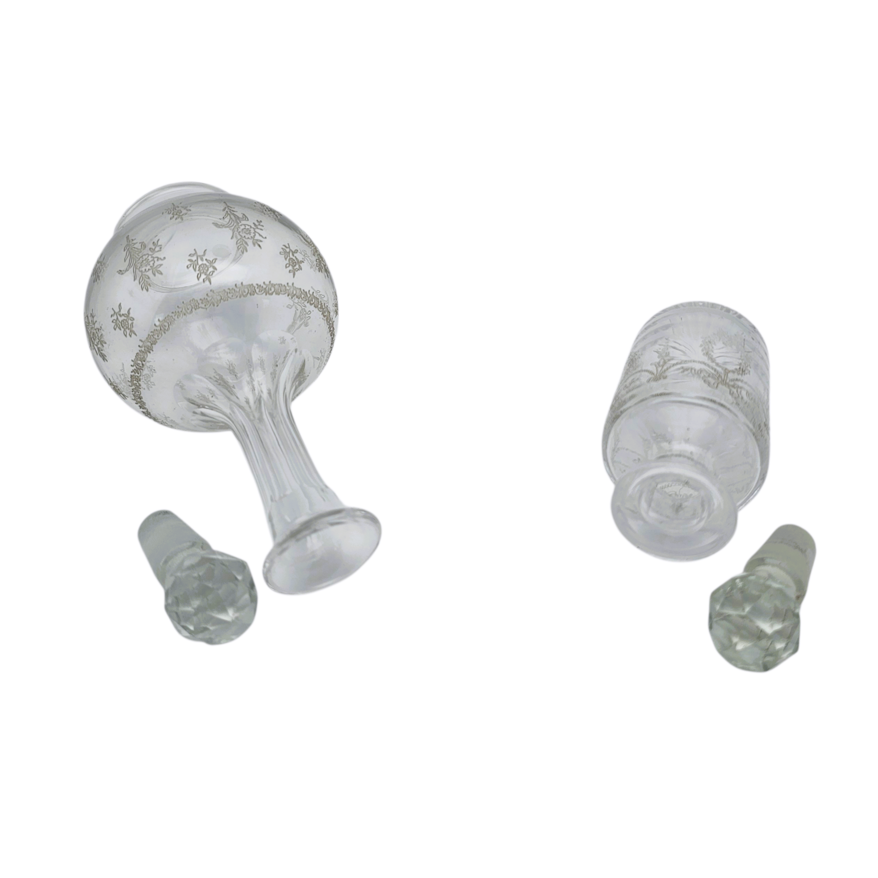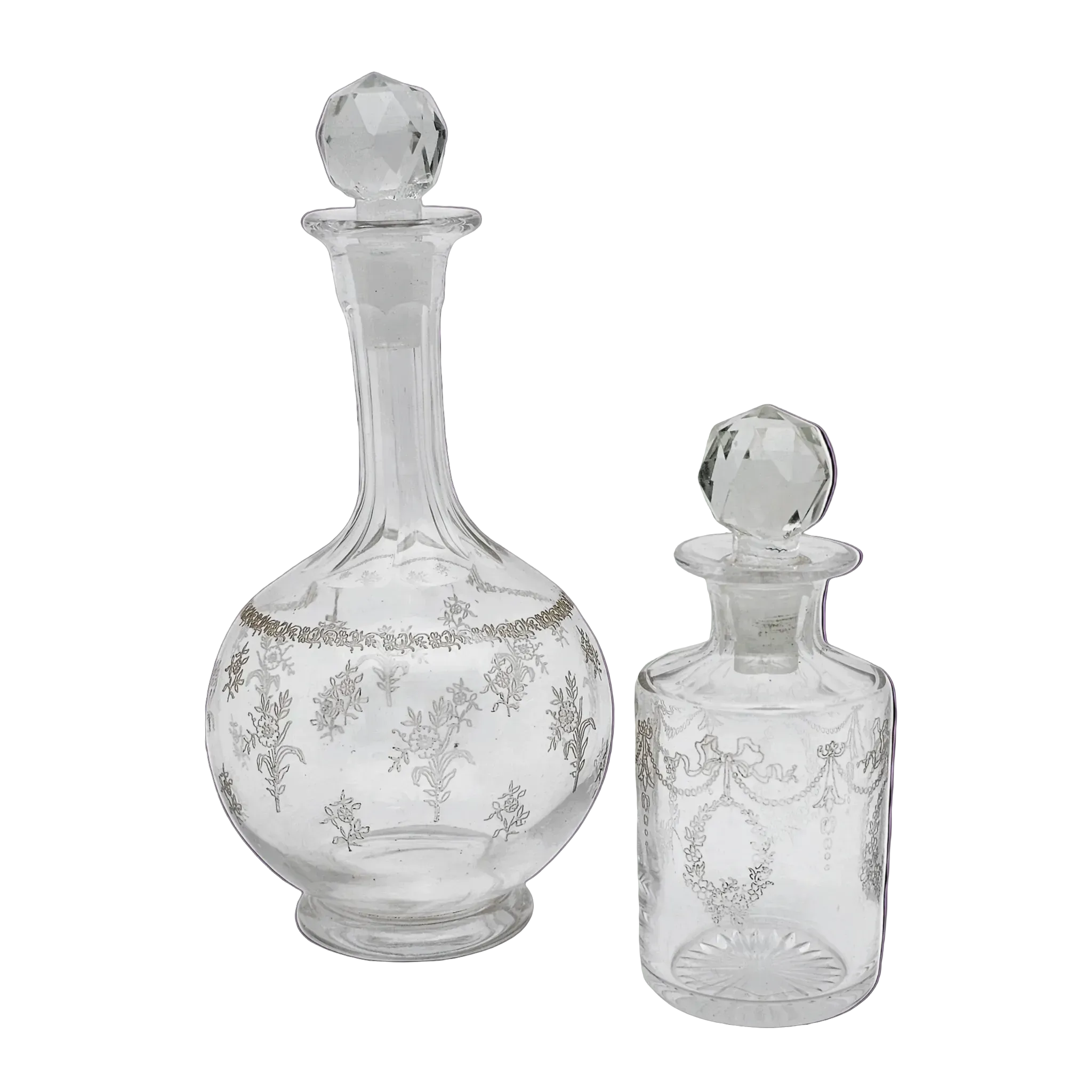 Charmant duo de flacons Belle Epoque en verre clair finement taillé et gravé, formant un ensemble très harmonieux bien qu’il ne soit pas d’origine.