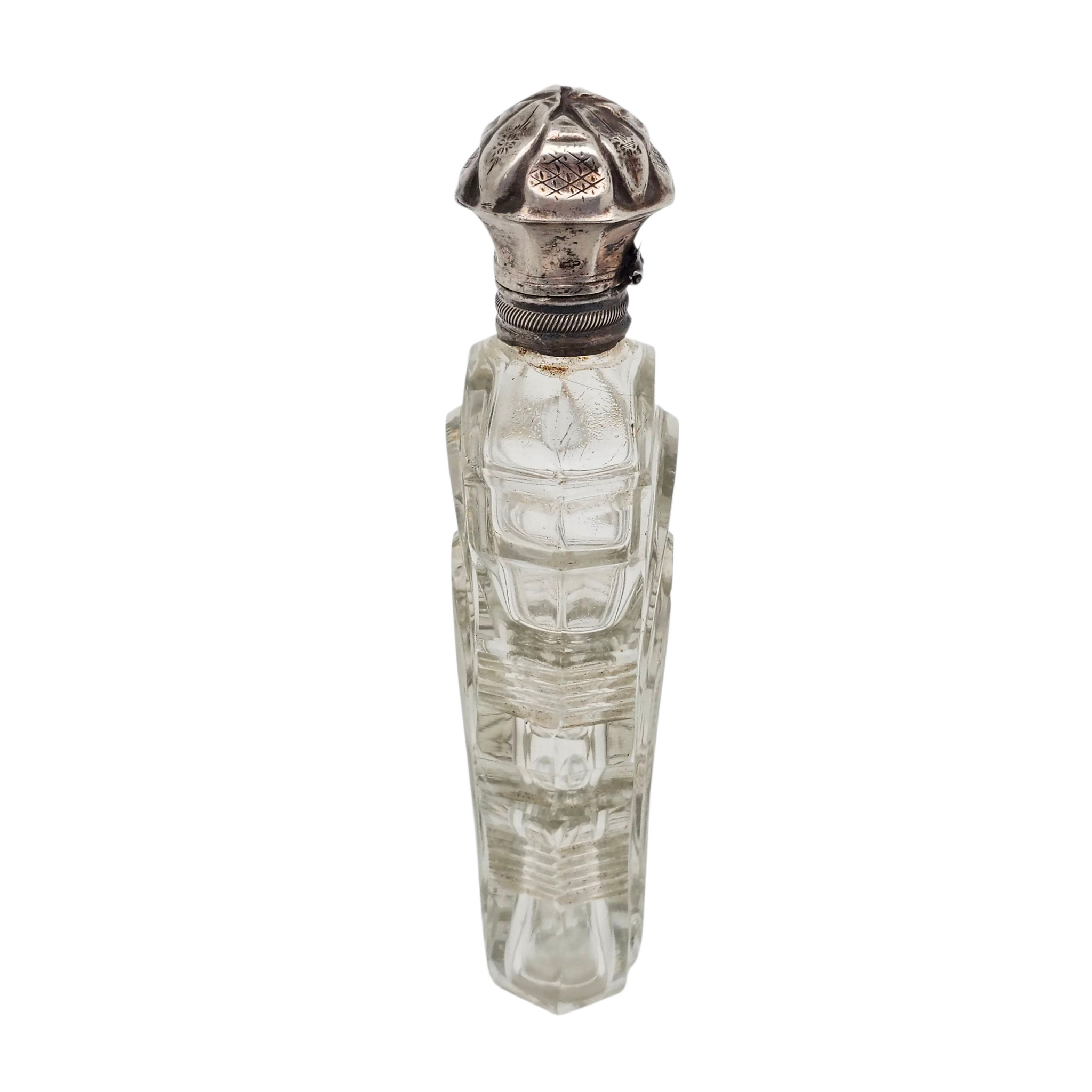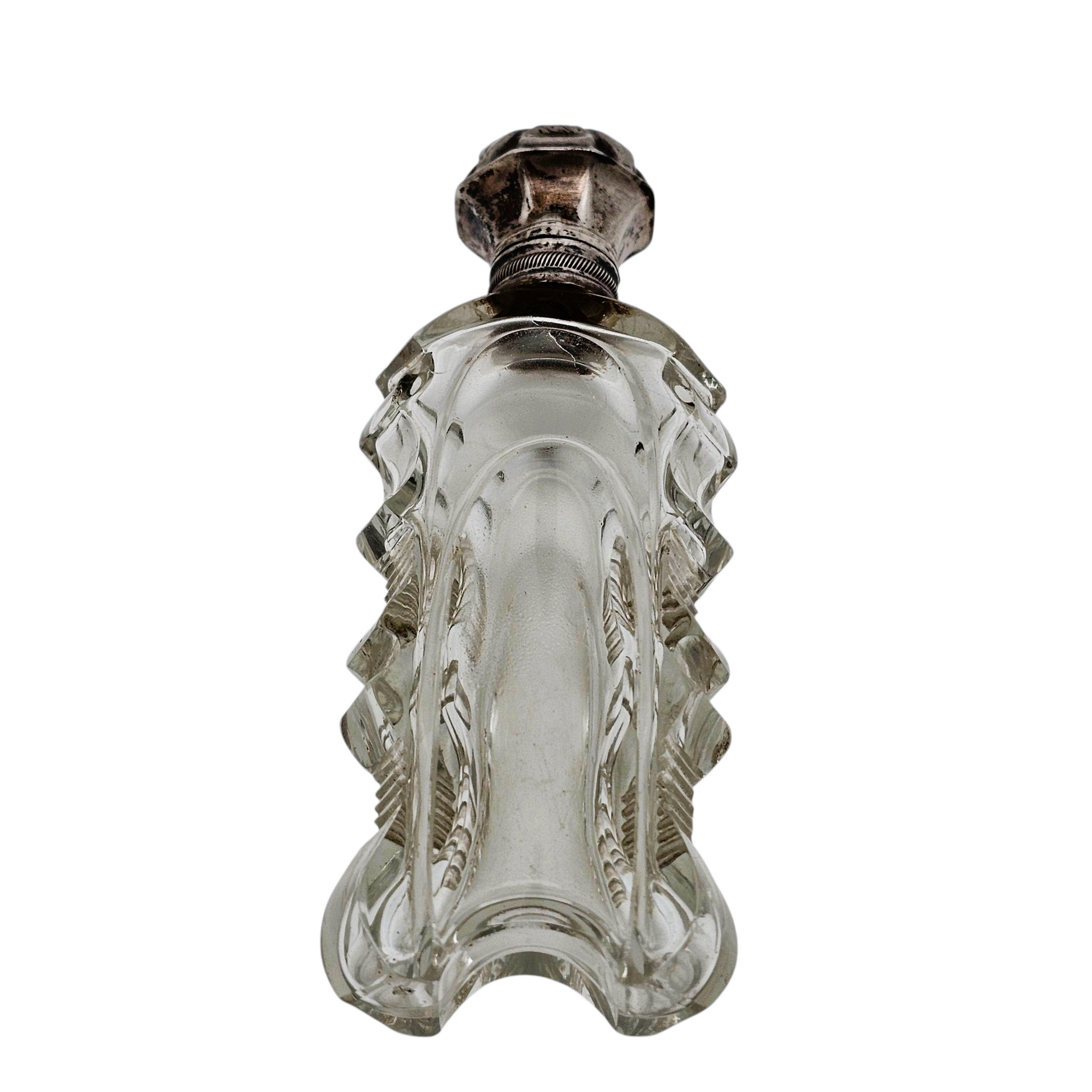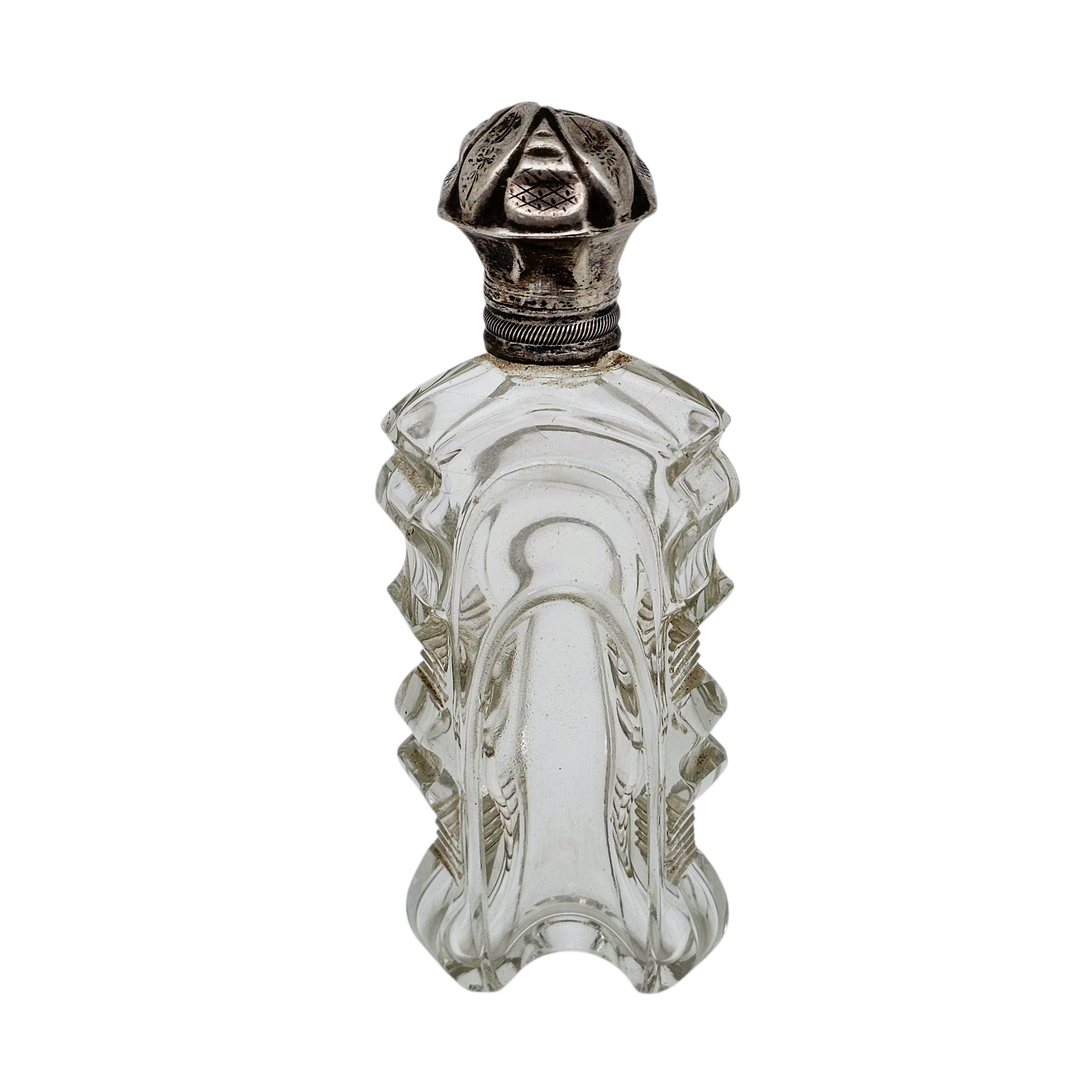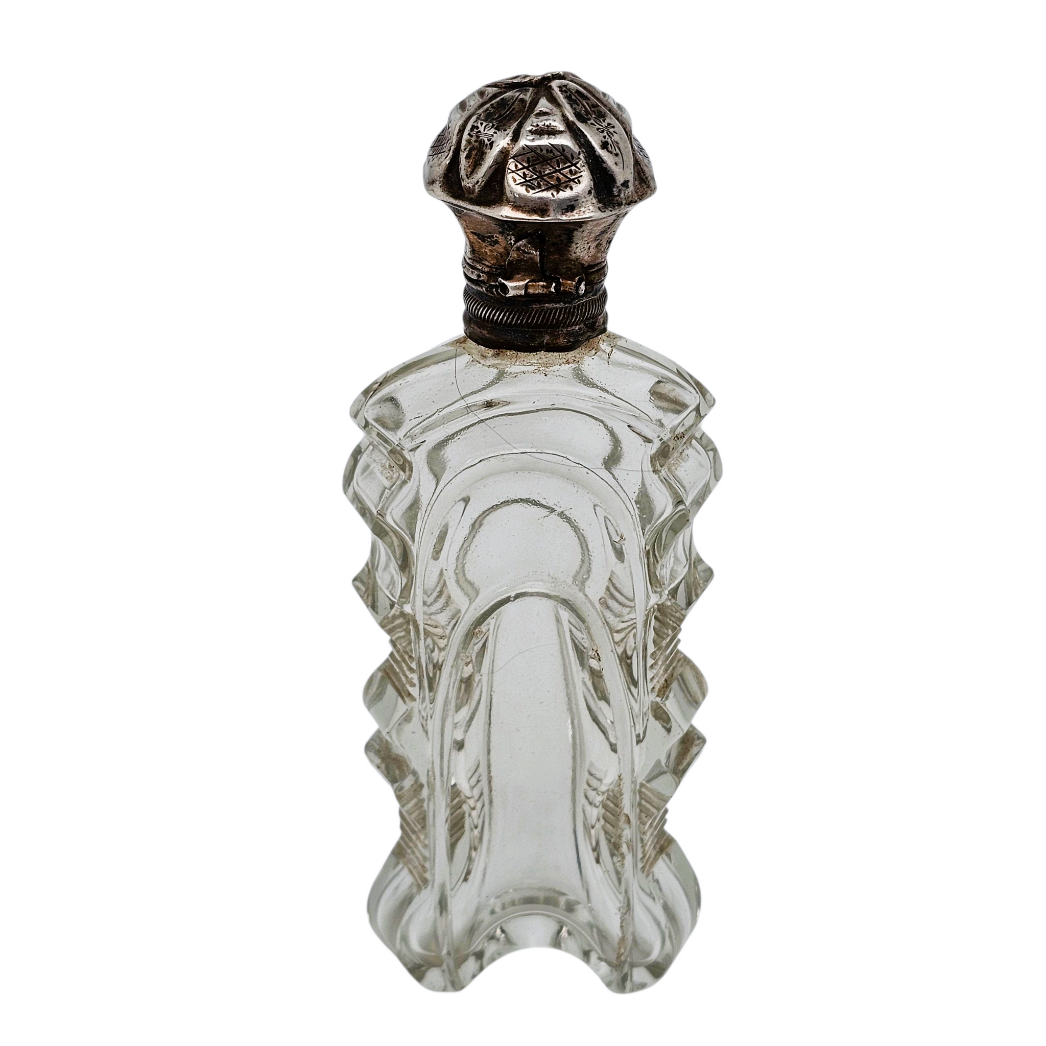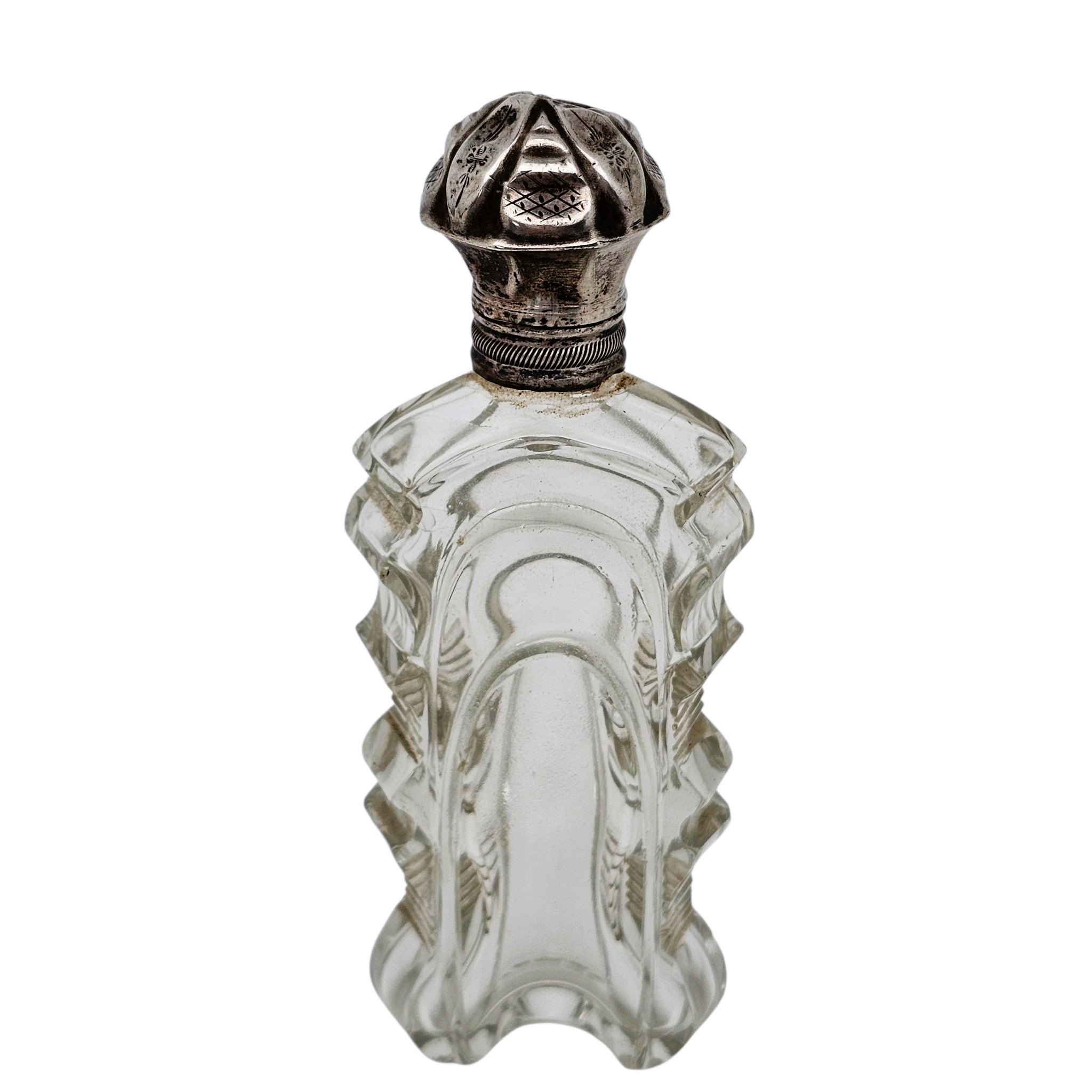 Son bouchon à charnière en métal argenté, finement orné de motifs géométriques et floraux, complète l’ensemble avec raffinement. L’intérieur conserve son rebord d’origine, témoignant du soin apporté à sa fabrication.