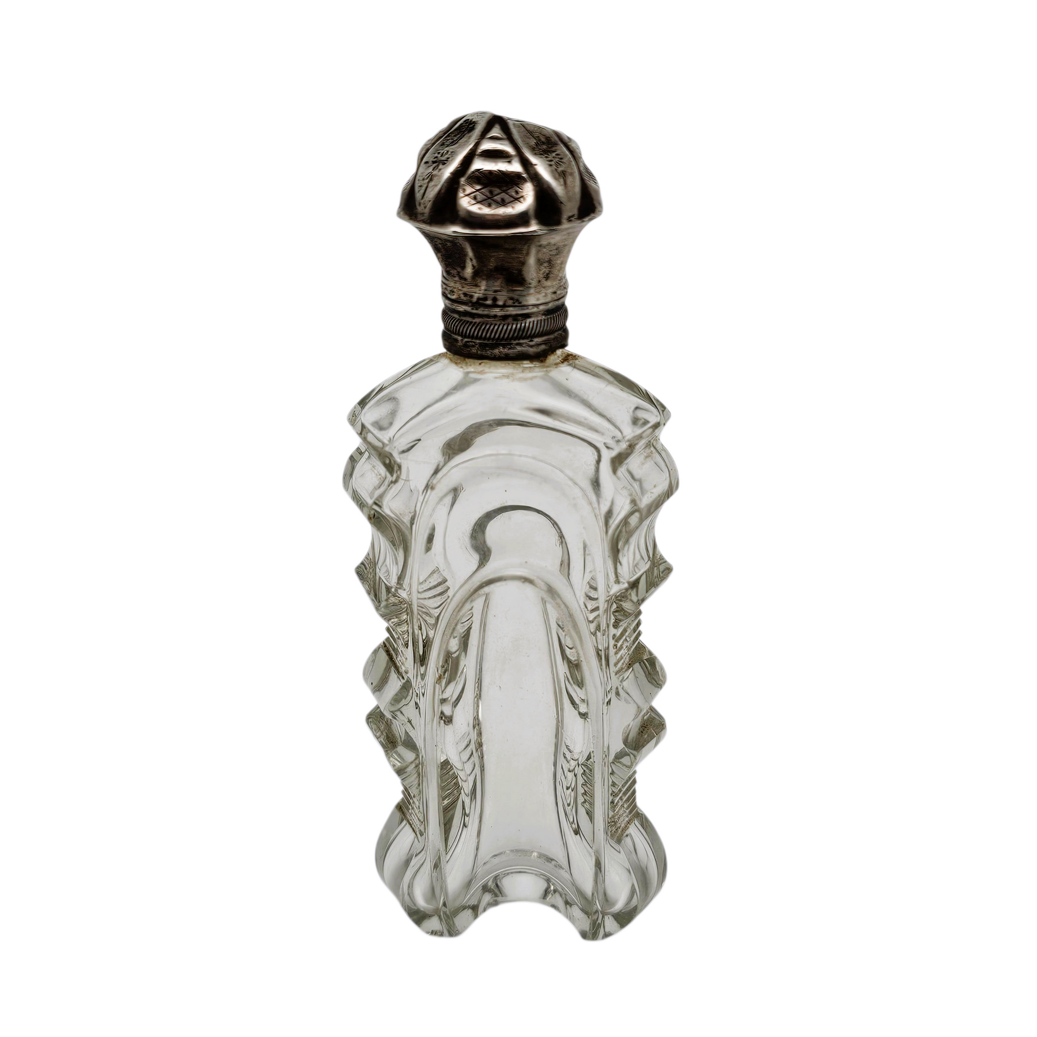Charmant flacon en verre moulé à décor nervuré et galbé, typique des créations de la fin du XIXᵉ siècle. Sa silhouette élancée et son jeu de reliefs lui confèrent un bel effet de lumière, tout en évoquant la délicatesse des nécessaires de toilette d’antan.