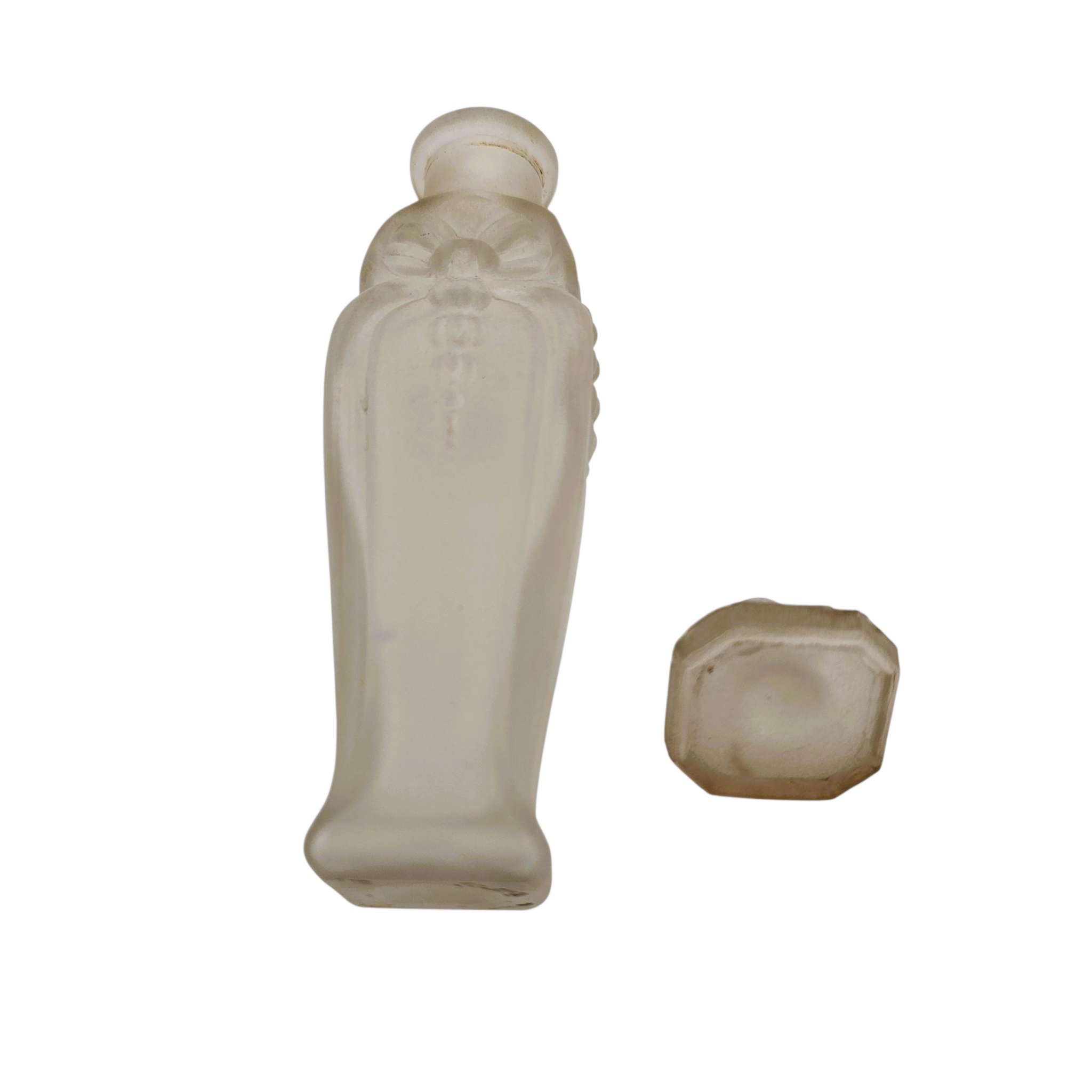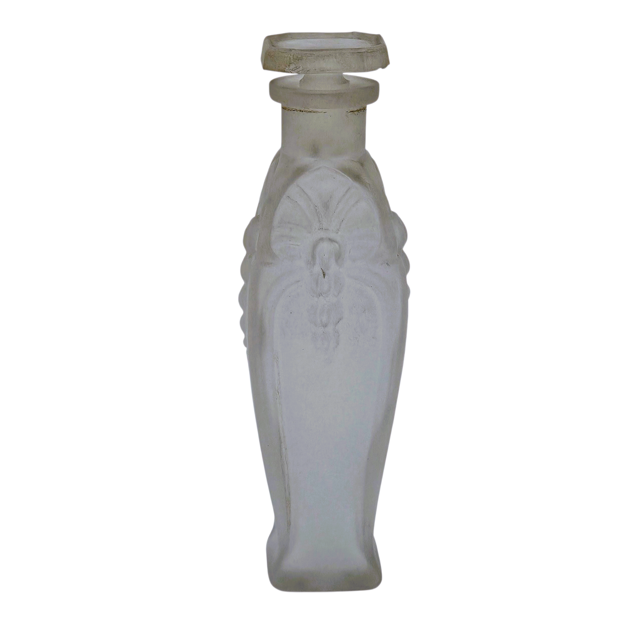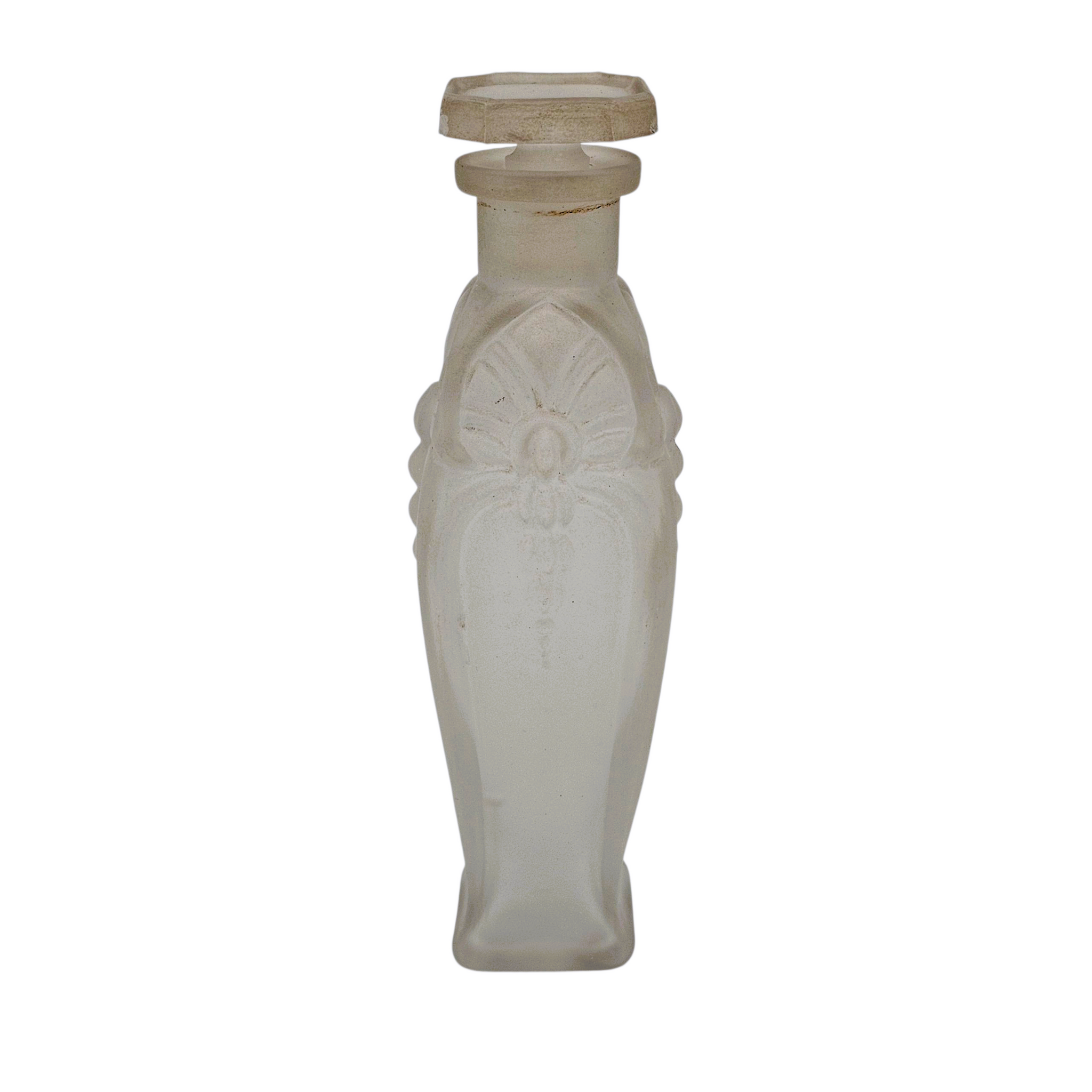 Délicat flacon à parfum en verre givré, moulé d’un décor en relief représentant une libellule stylisée, symbole de légèreté et de métamorphose.