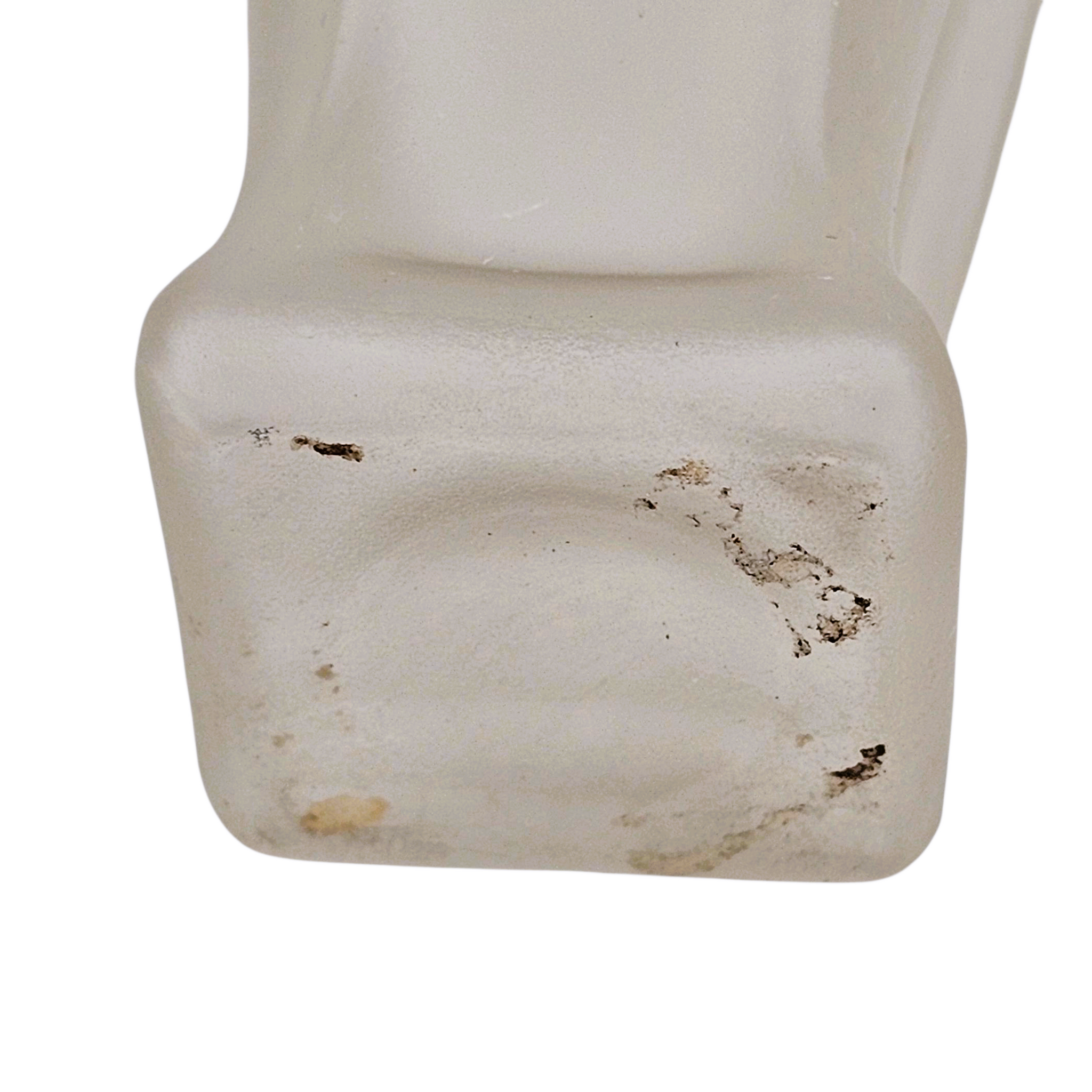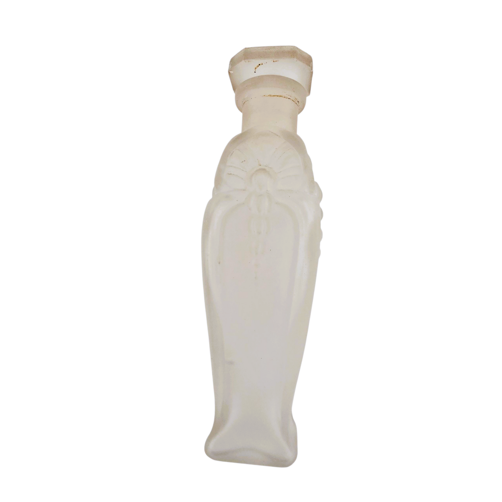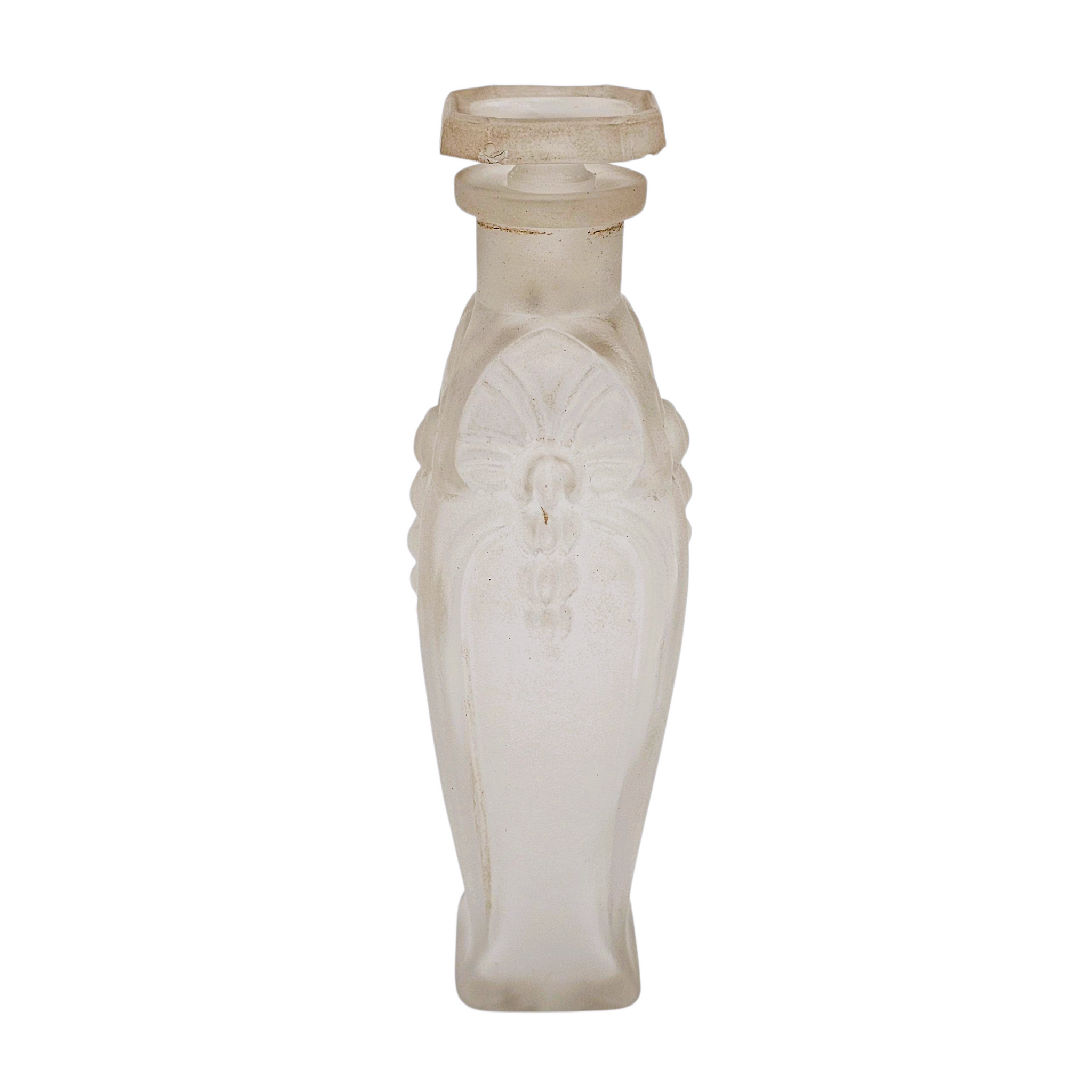 Délicat flacon à parfum en verre givré, moulé d’un décor en relief représentant une libellule stylisée, symbole de légèreté et de métamorphose.