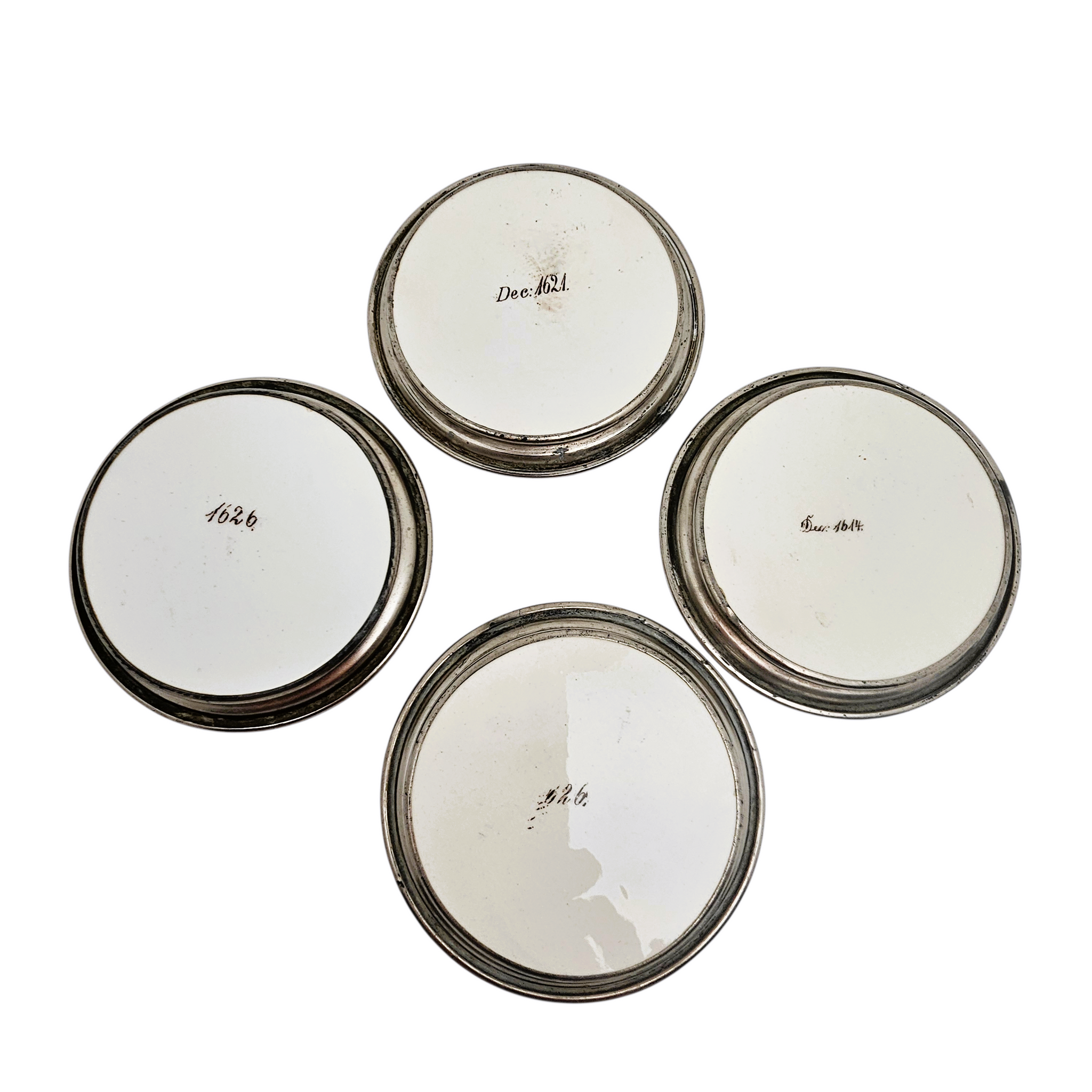 Chaque sous-verre est serti dans une monture en métal blanc, non poinçonné, probablement nickelée, caractéristique des productions décoratives des années 1950.