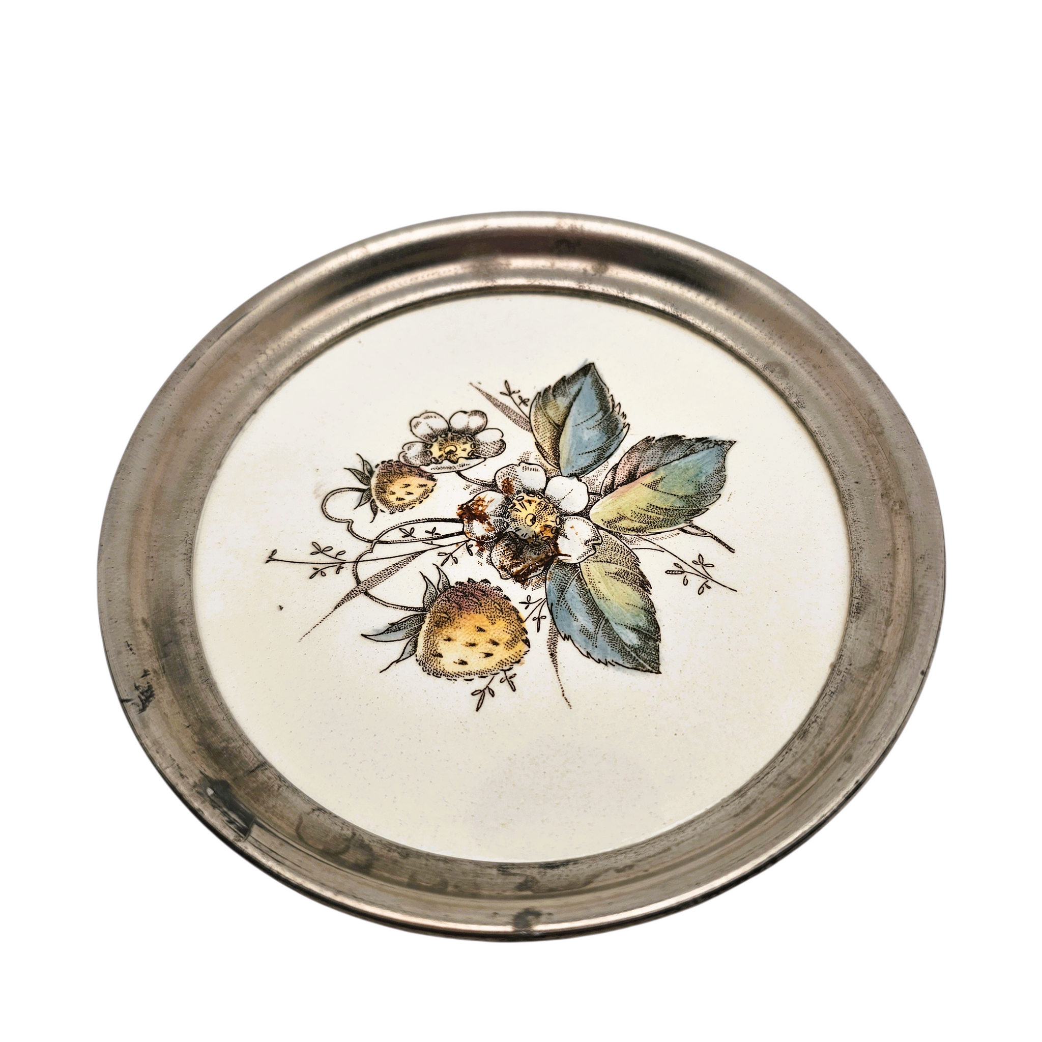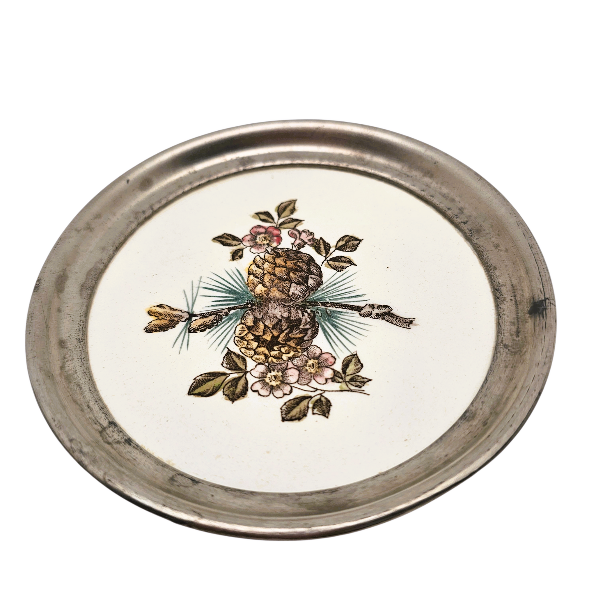 Matériaux : céramique blanche décorée ; monture en métal blanc (probablement nickelée) Dimension : 9,3 cm de diamètre, 1,3 cm de hauteur, poids total : 200 g