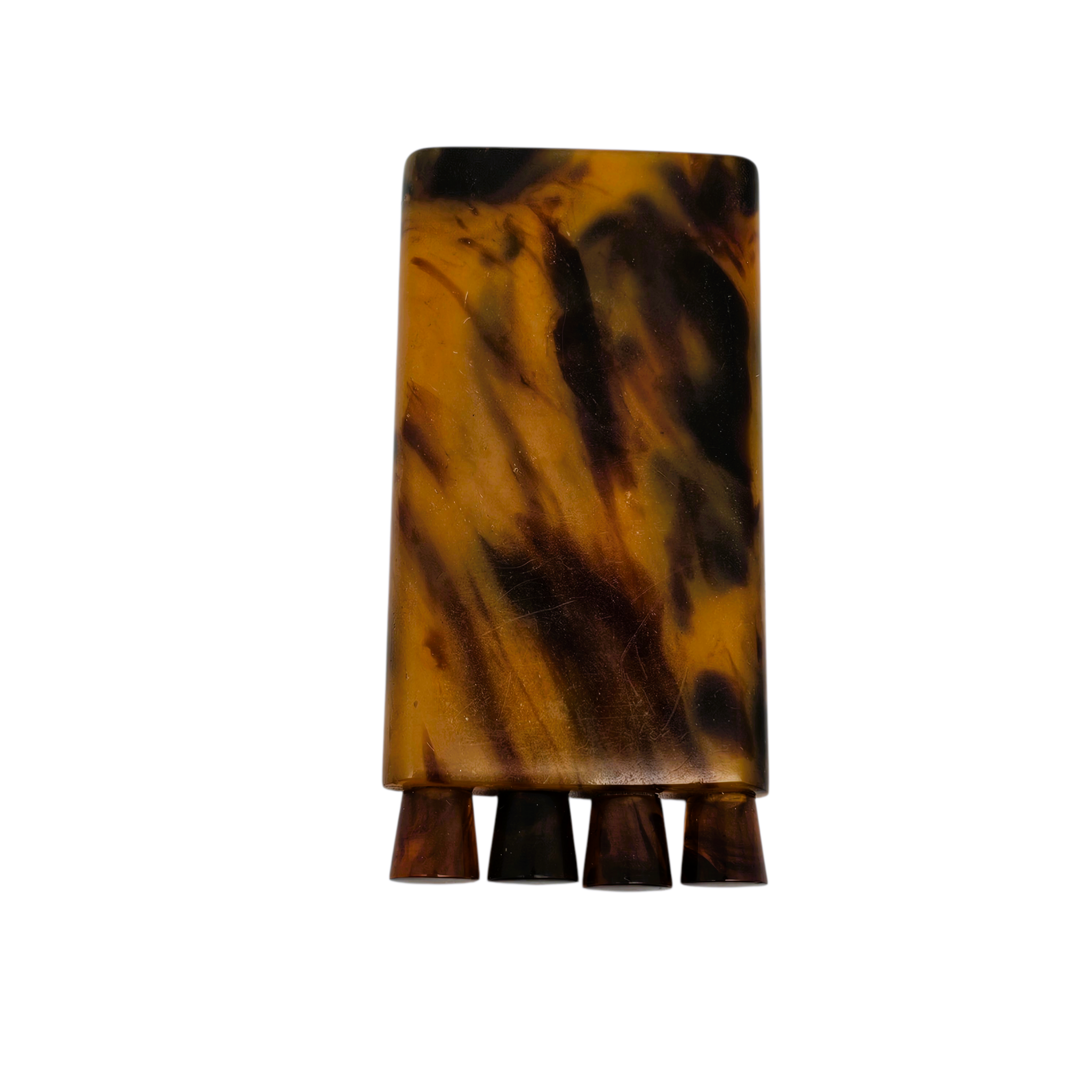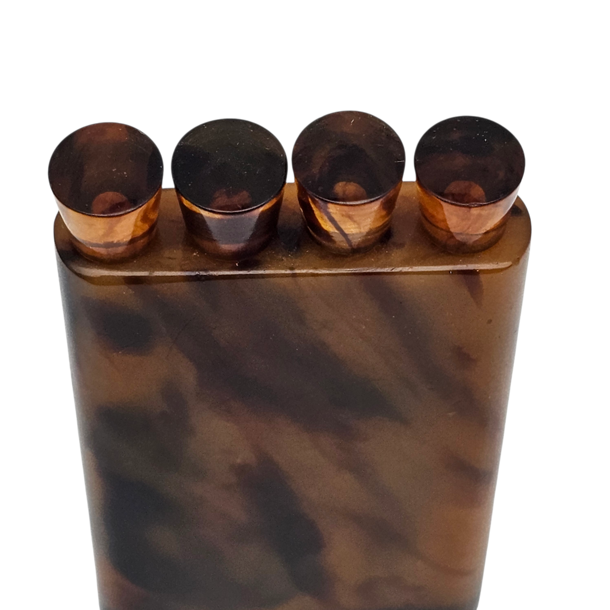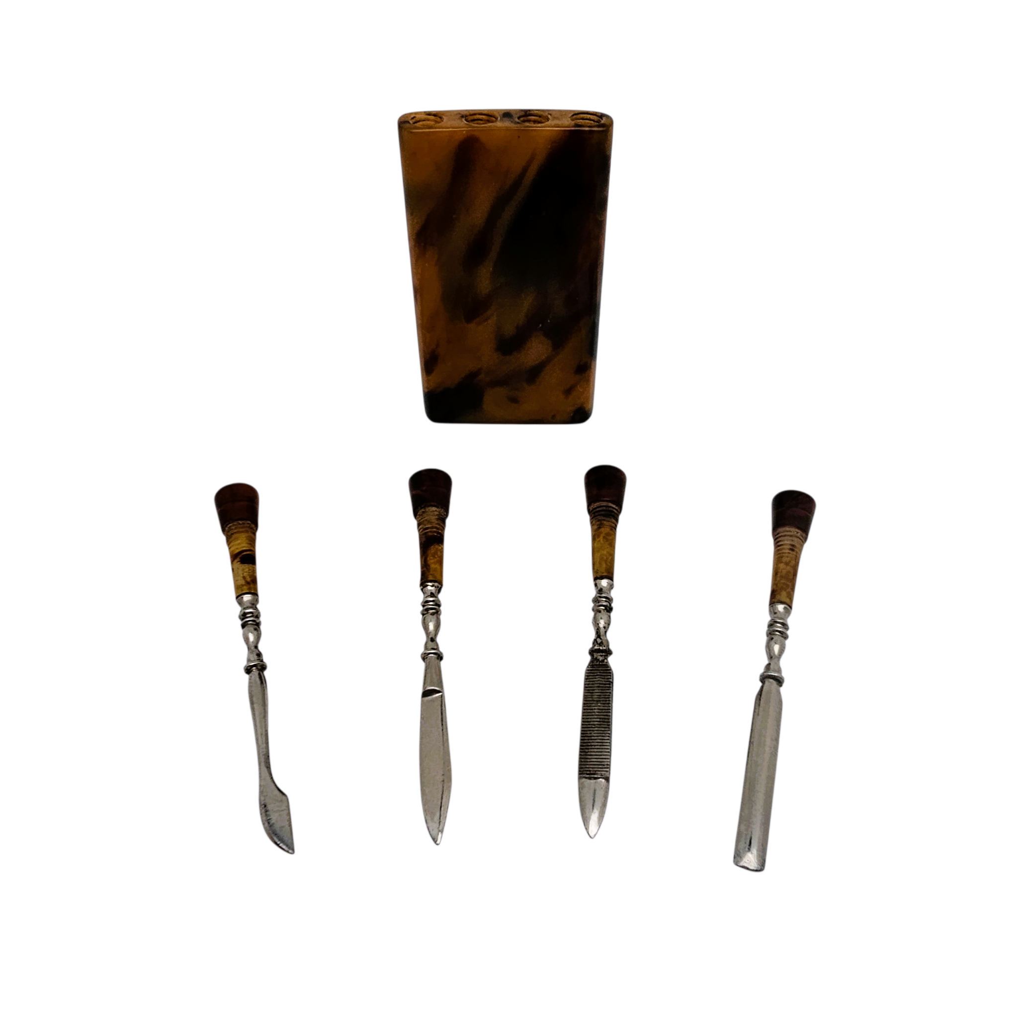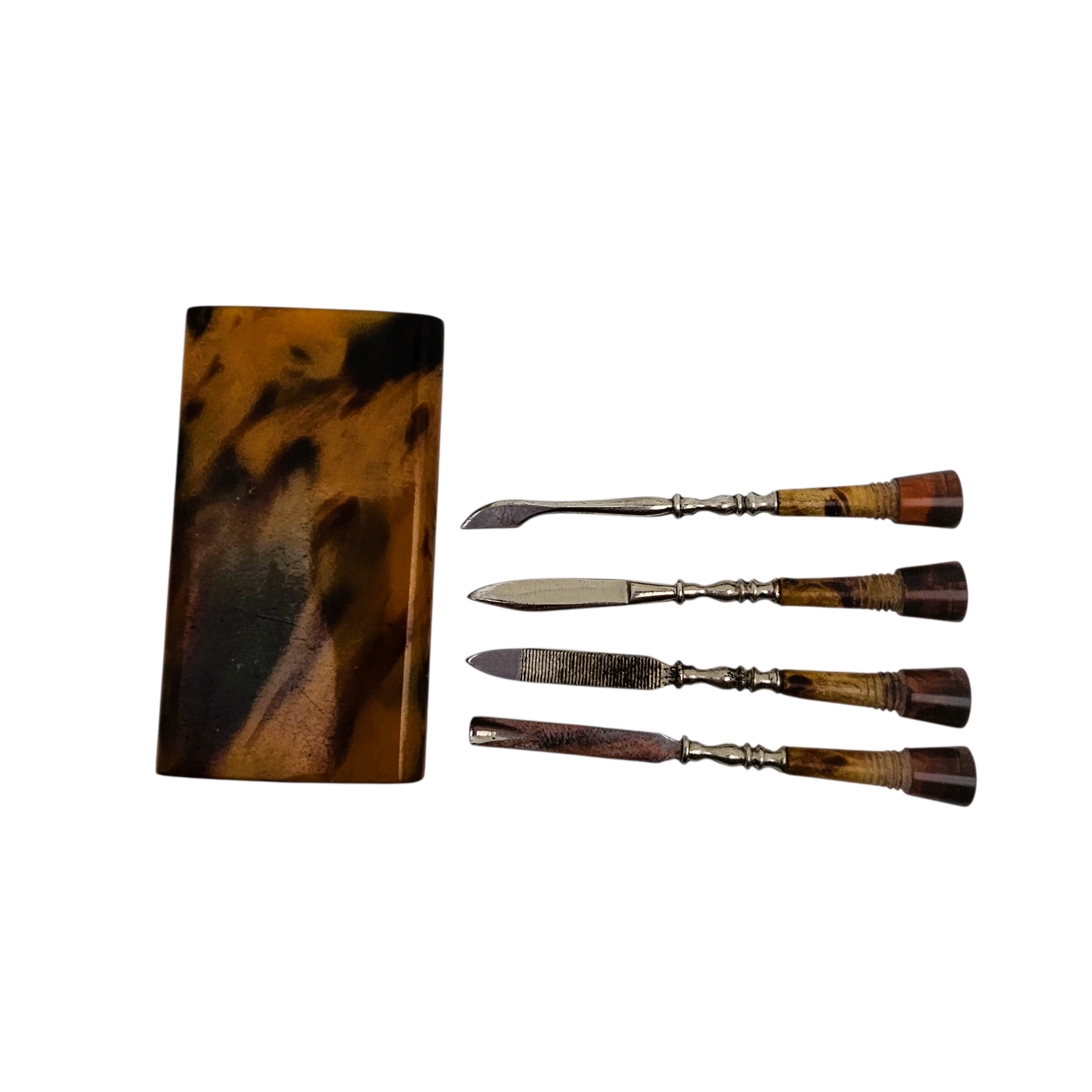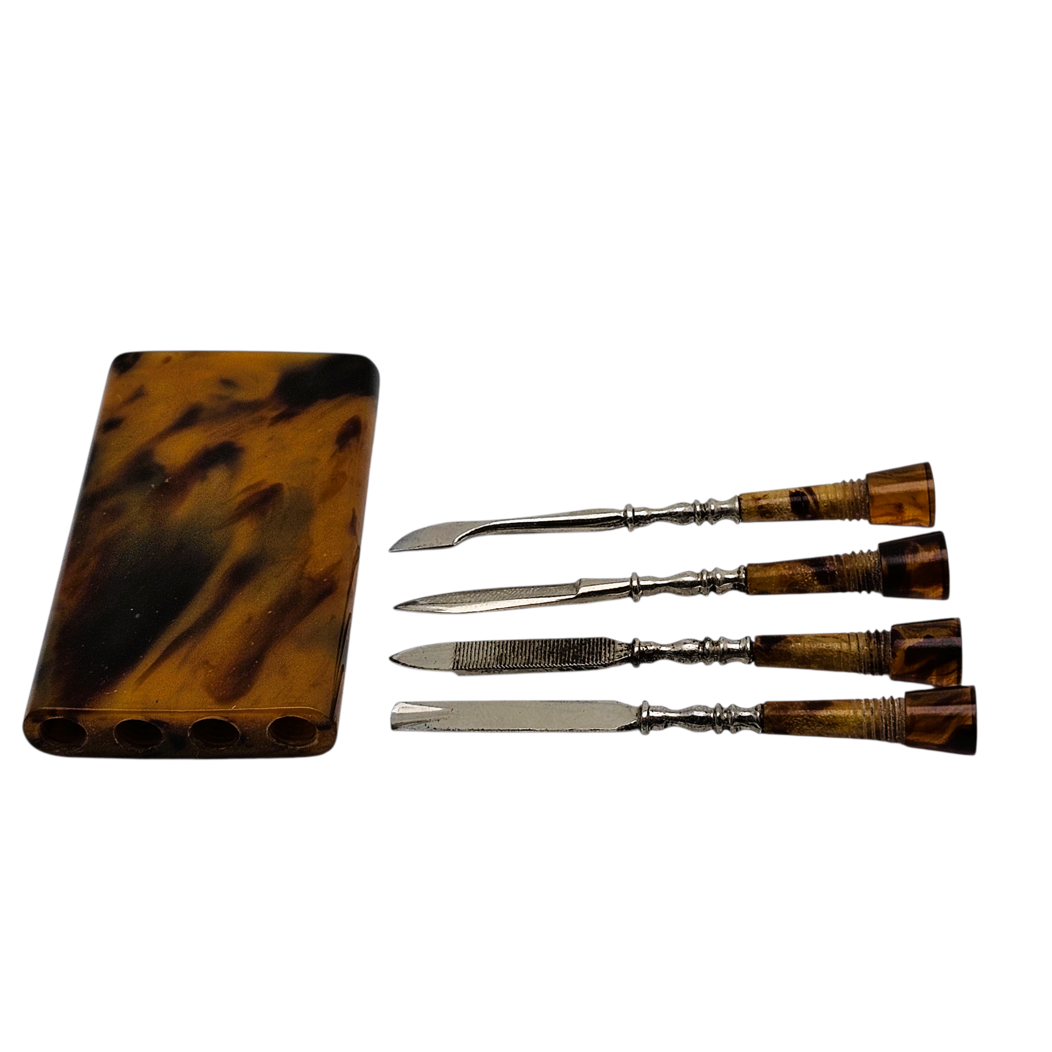 Charmant nécessaire de manucure de sac, composé de quatre outils se vissant dans leur étui rectangulaire en bakélite marbrée, aux chaudes nuances brun miel et écaille.