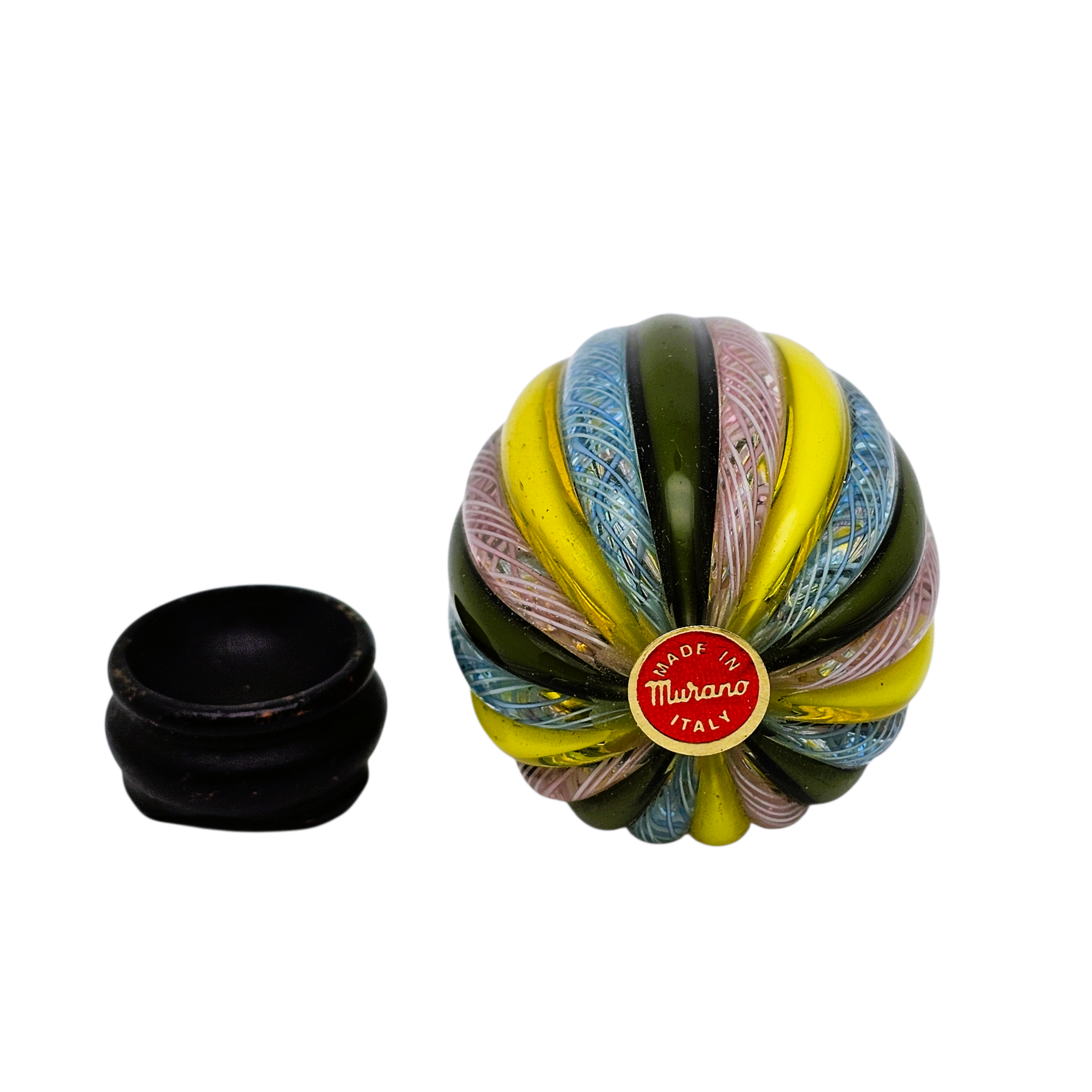La palette est très typique des productions muranaises de la seconde moitié du XXᵉ siècle, probablement années 1960–1980 : couleurs franches, décor lisible, objet décoratif assumé.