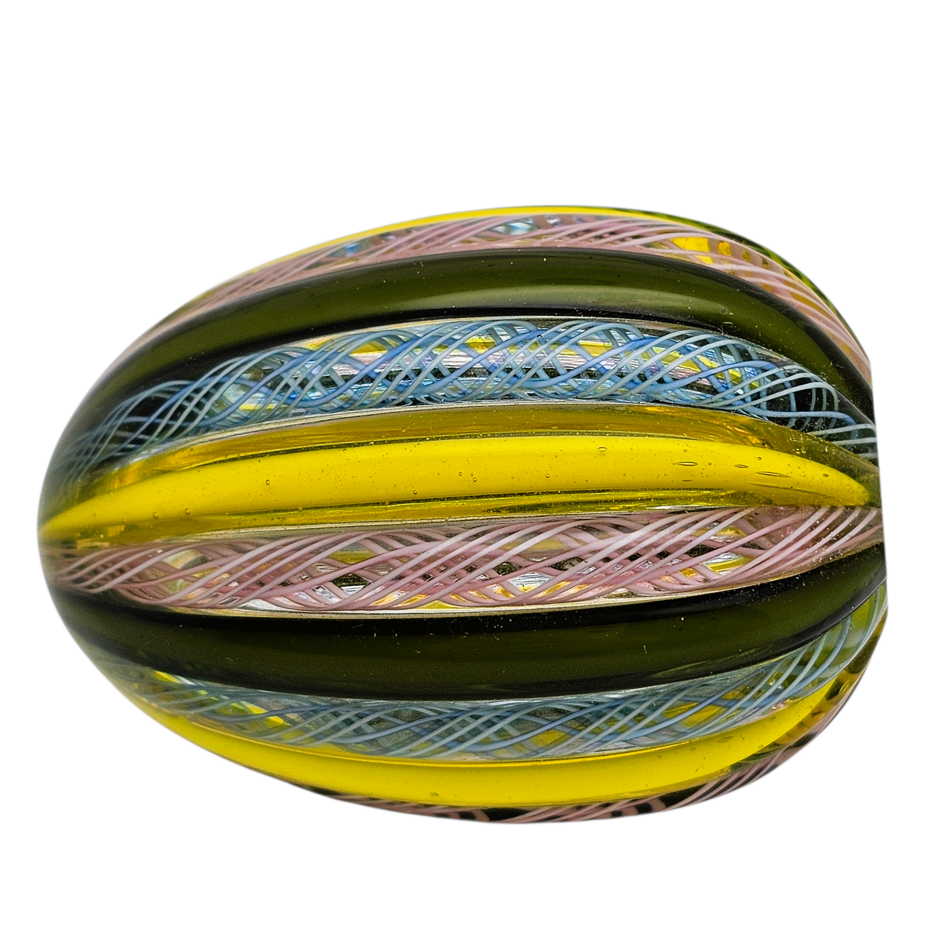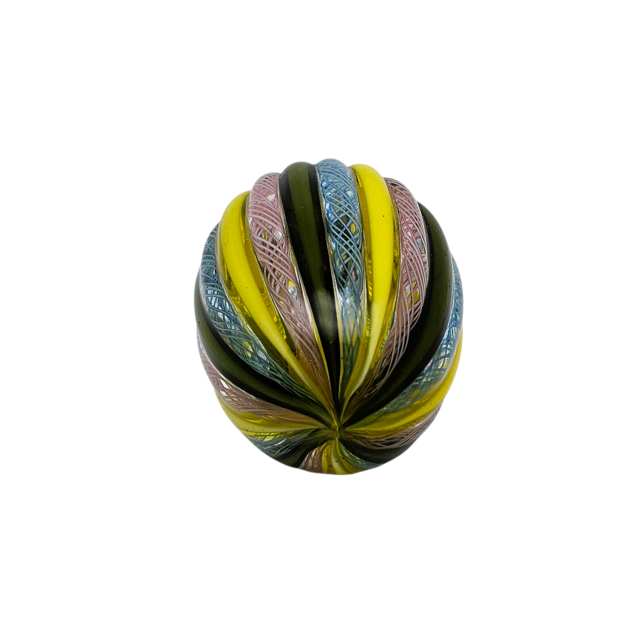 Très bel œuf décoratif en verre de Murano, réalisé selon la technique traditionnelle du filigrane, avec de délicats entrelacs de verre bleuté et rosé, soulignés par de larges côtes de verre jaune et vert profond.